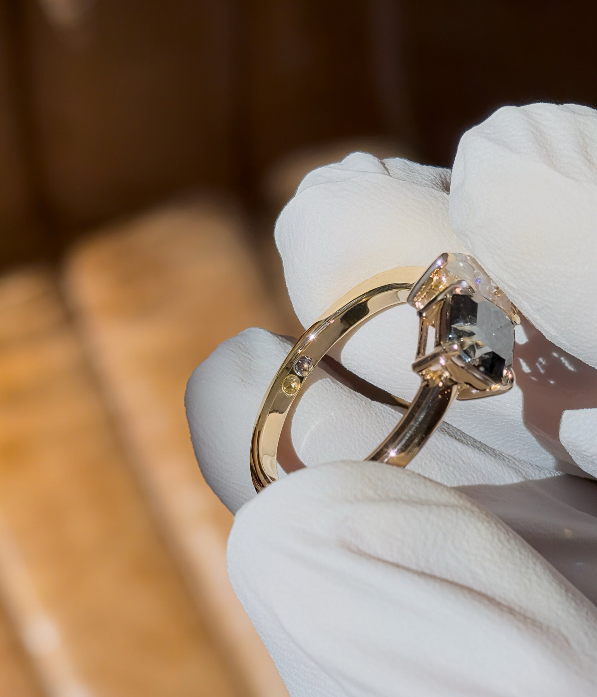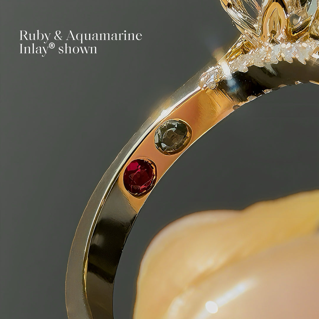 A Stone Inlay® is a tiny gemstone set inside your ring’s band — a personal detail only you know is there. Each inlay takes time and steady hands. We shape and set every stone by hand until it sits perfectly flush with the gold.