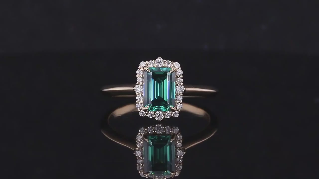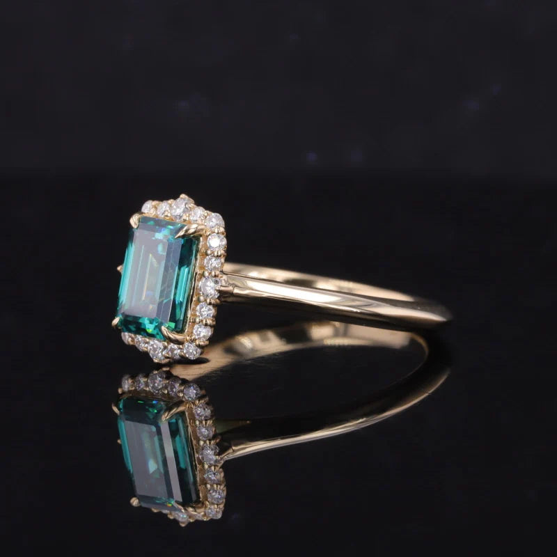 5x7mm, 1.00ct Emerald Cut Green Moissanite with Diamond Halo Ring in 14K Solid Yellow Gold