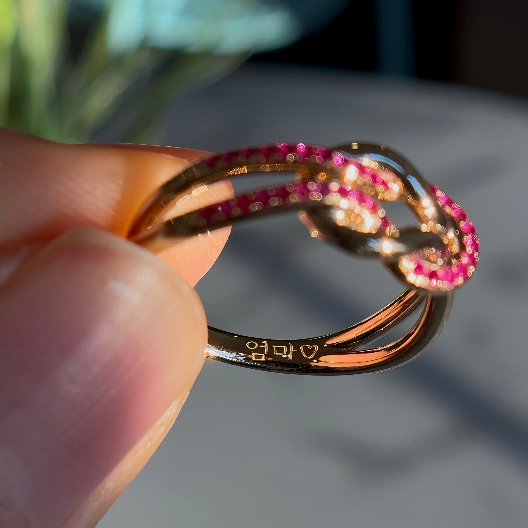 A symbol of love and devotion, this elegant knot ring features 33 meticulously set AAA natural red rubies that radiate passion and timeless beauty. The delicate yet intricate knot design represents unbreakable bonds, making it a meaningful gift or personal keepsake.