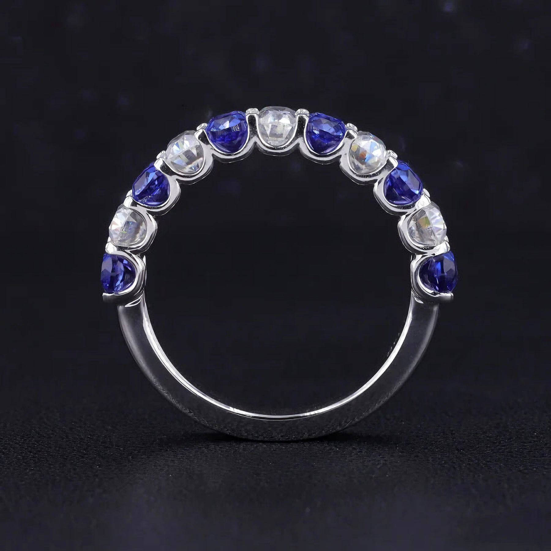 Make a statement with this 3.35ctw oval-cut band featuring alternating Lab-Grown Blue Sapphires and sparkling Lab-Grown Diamonds. Set in polished 14K white gold, each 3x5mm stone creates a striking rhythm of color and brilliance. At 5mm wide, this half-eternity band has presence and elegance — perfect as a unique wedding band, anniversary ring, or right-hand piece that captures timeless beauty.