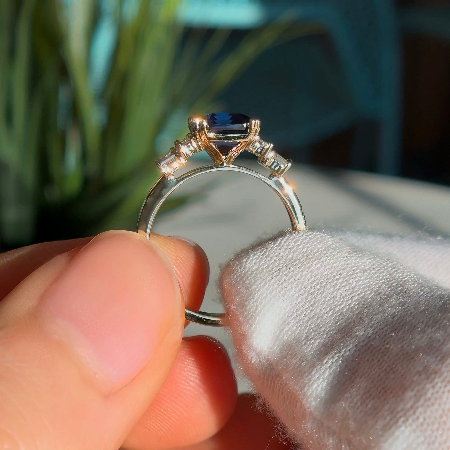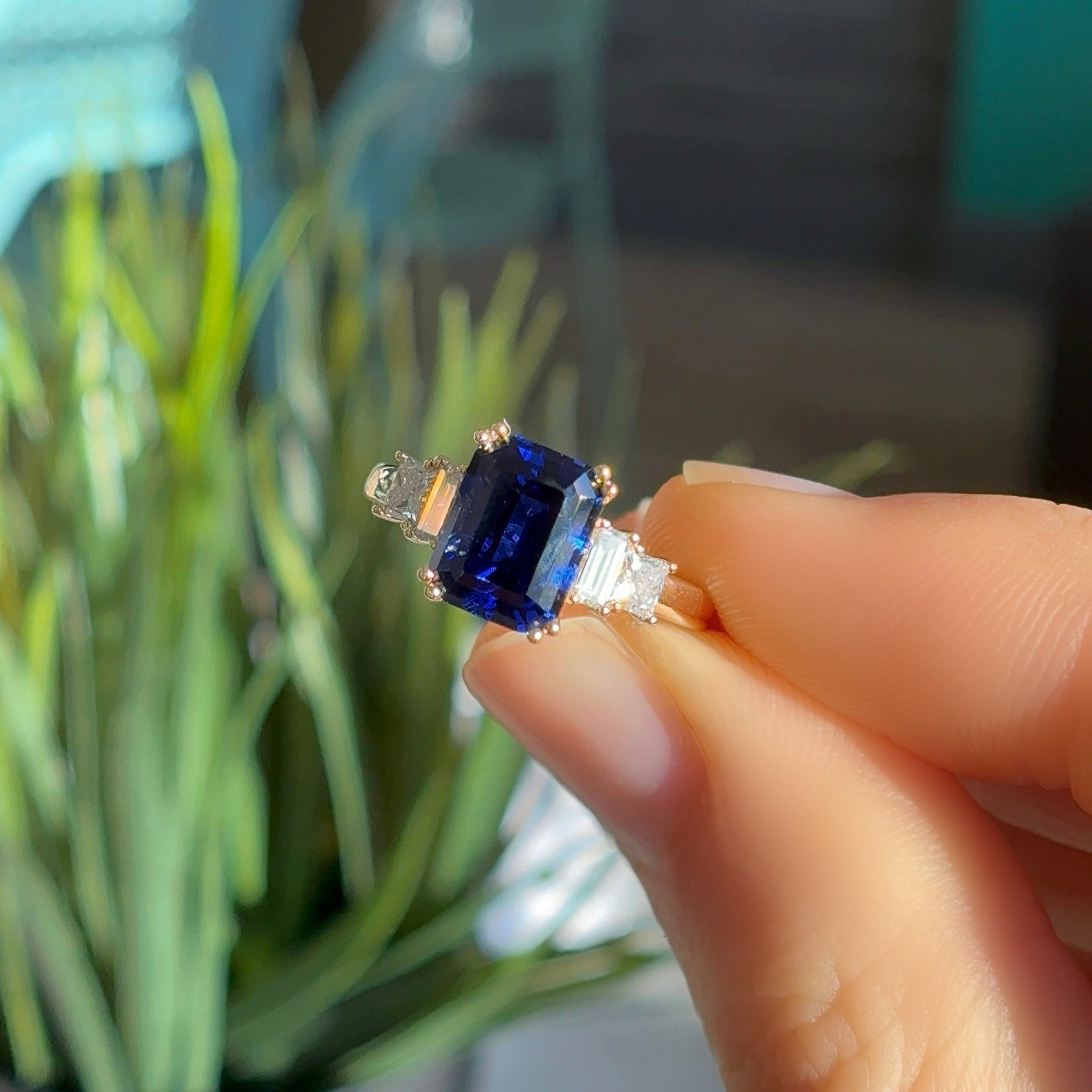 An architectural masterpiece in color and light. Centered by a 4.5ct emerald-cut blue sapphire, this five-stone design features tapered baguette/princess cut diamonds on each side — precision-set to emphasize the sapphire’s bold geometry and deep royal hue.