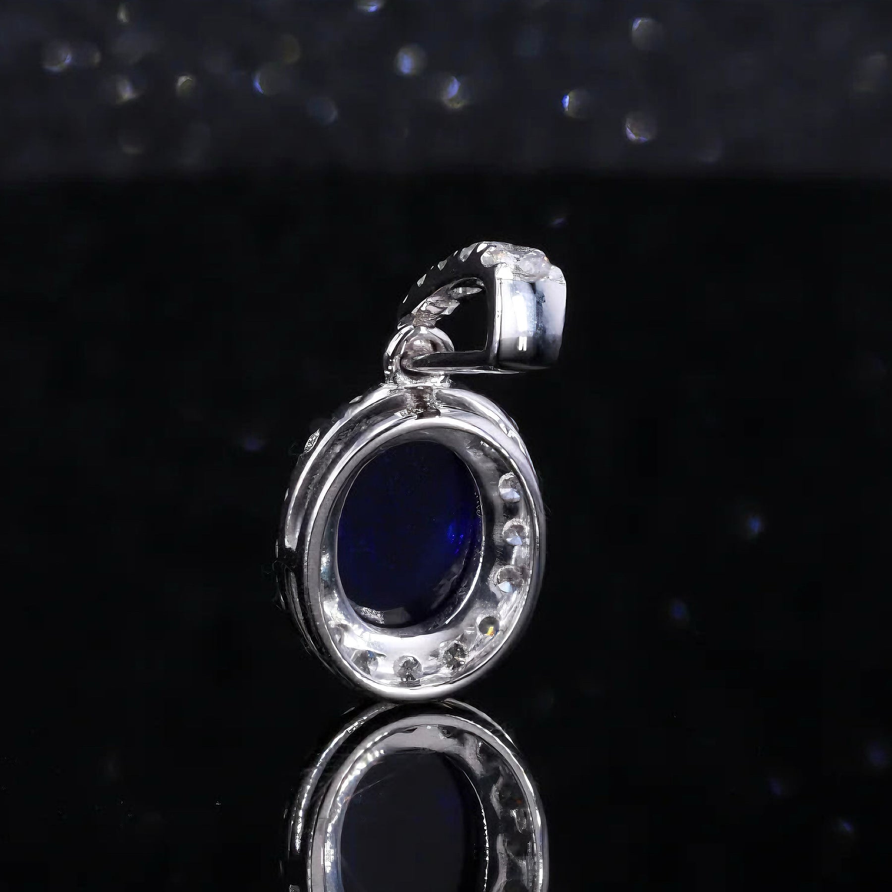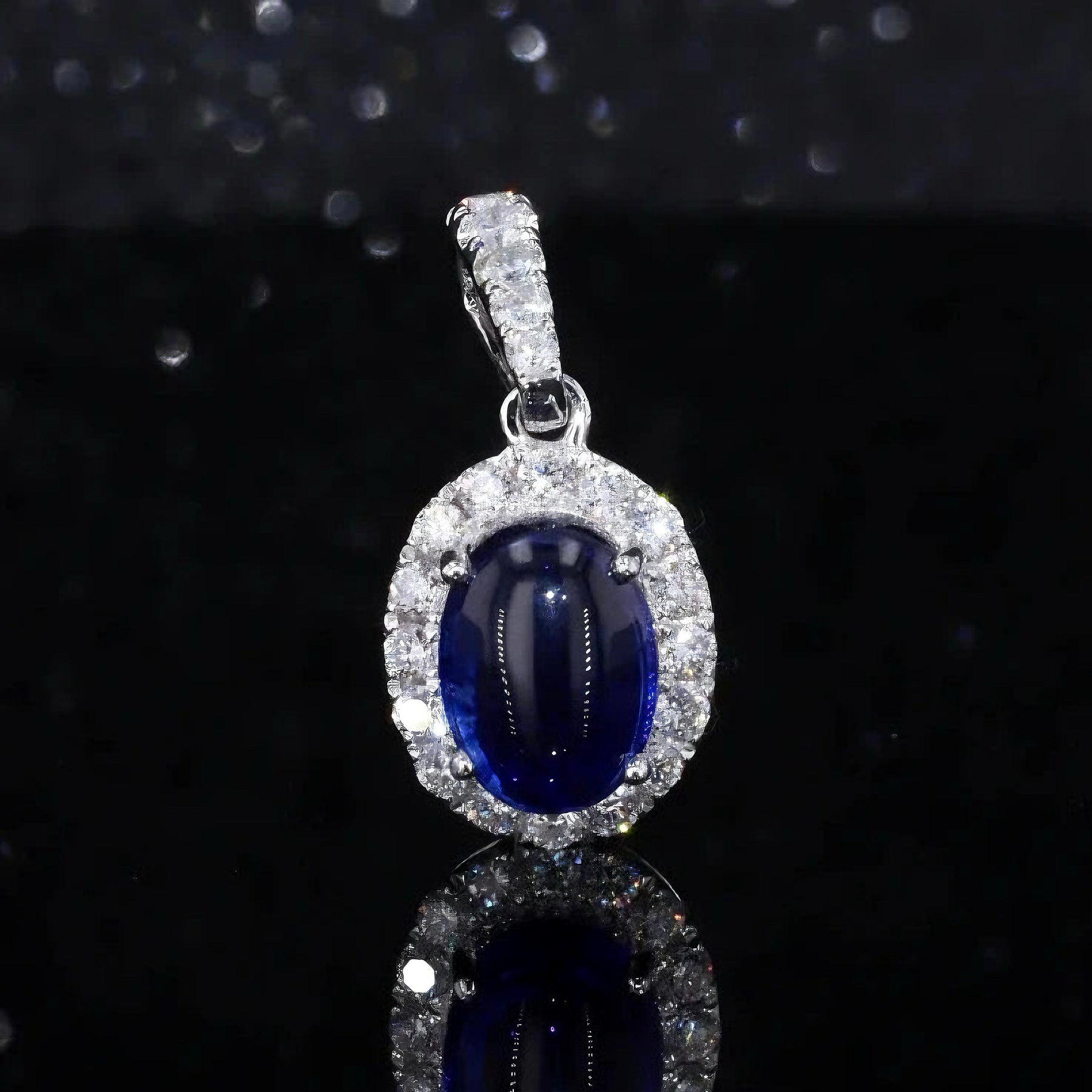 6x8mm, 1.80ct Oval Cabochon Lab-Grown Blue Sapphire with Diamond Halo Pendant in 14K White Gold
