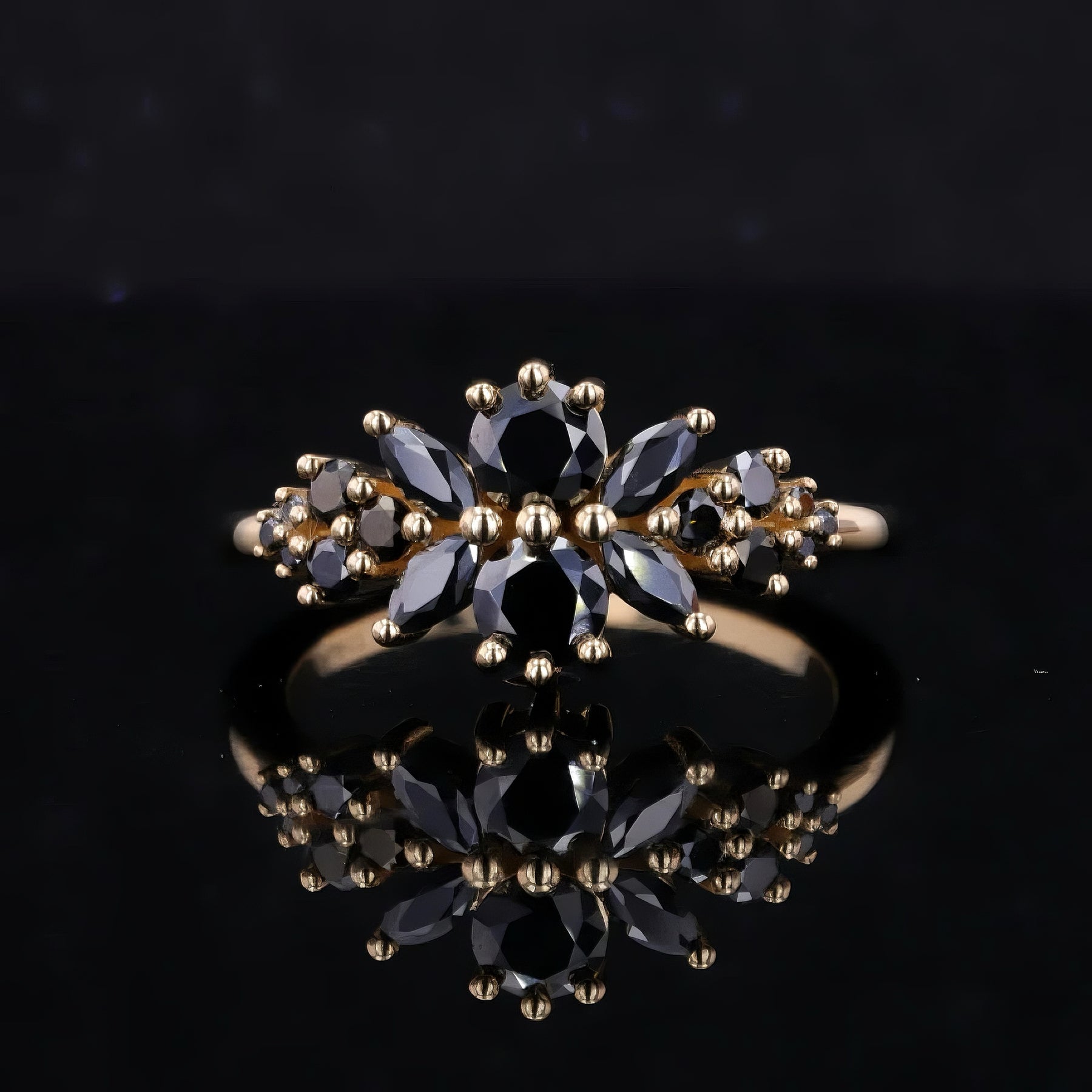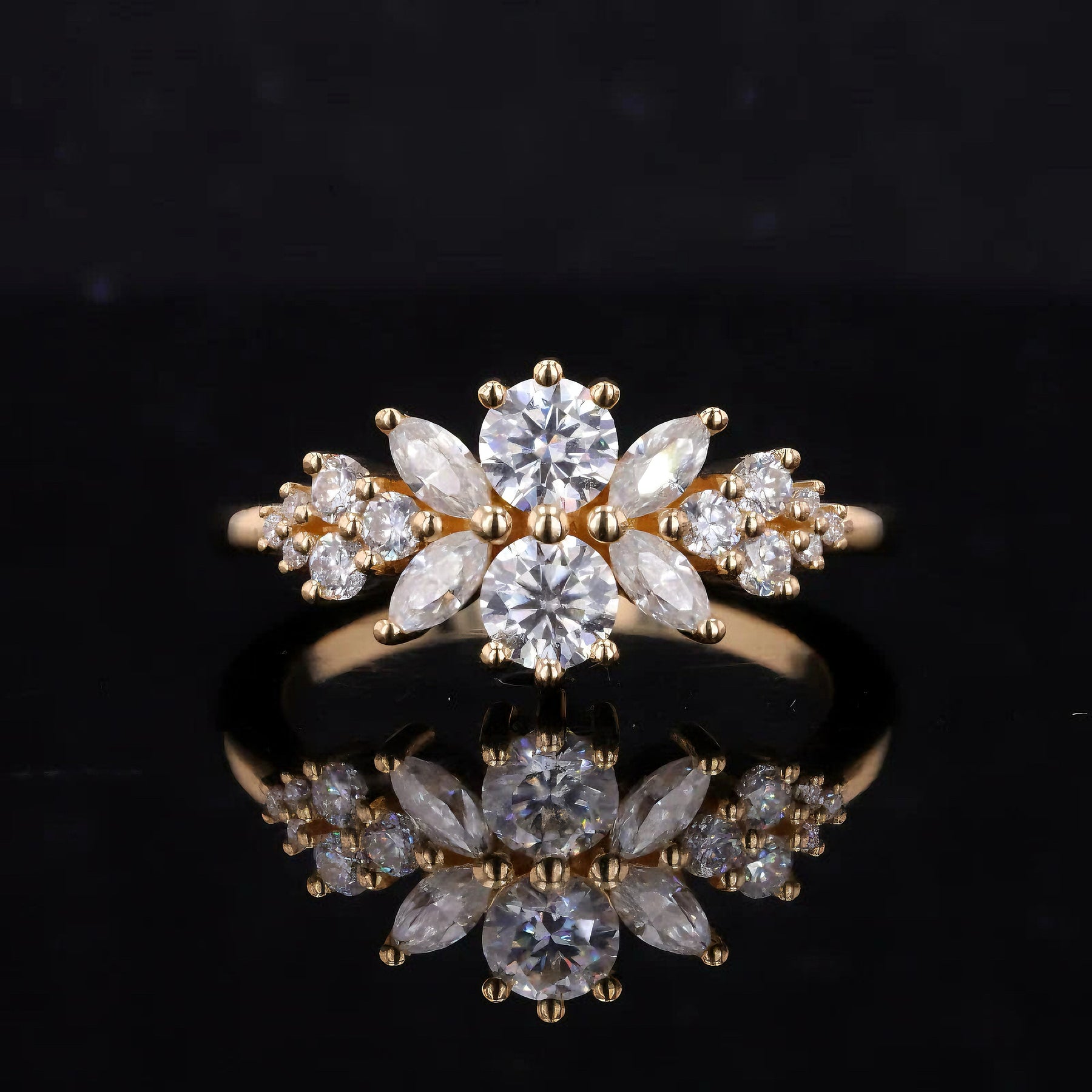 Round & Marquise Stones – Alternating cuts create depth, symmetry, and a petal-like motif reminiscent of a blooming rose.