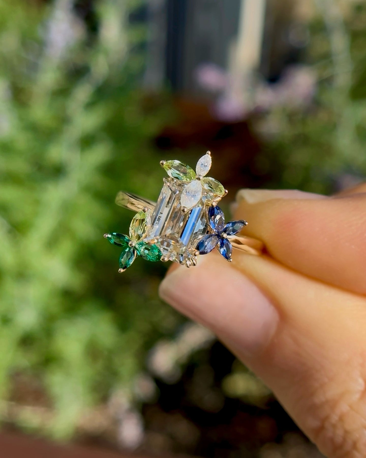 The Jardin Floral Setting – Marquise-cut petals of emerald, peridot, sapphire & moissanite create a blooming halo of color.