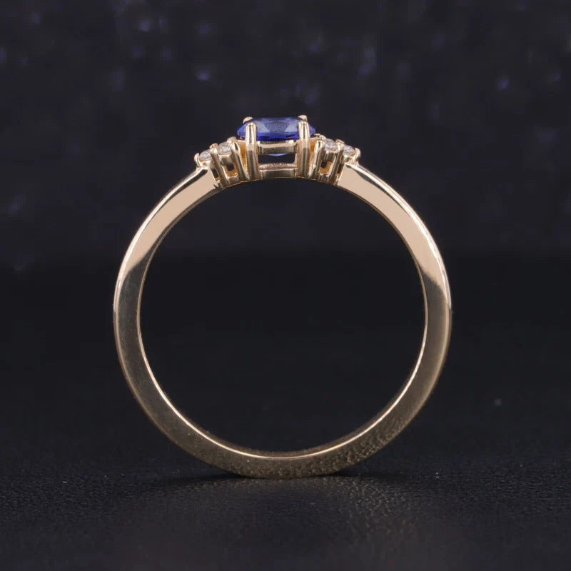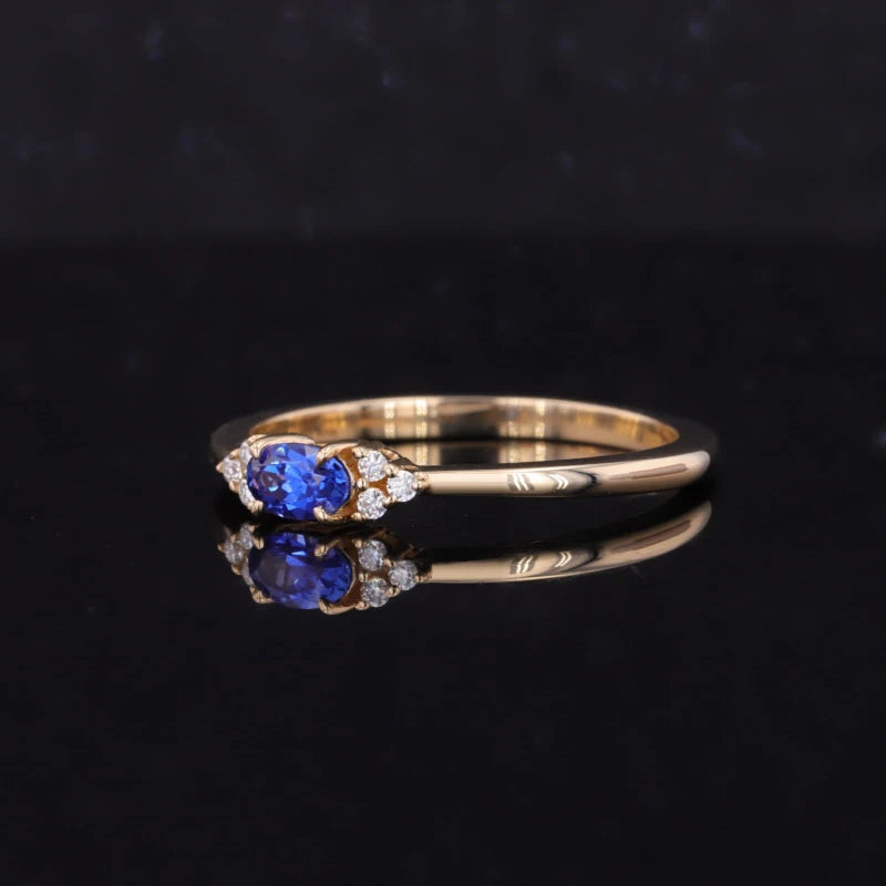 Oval Cut Blue Sapphire (3x5mm): A striking, rich blue gemstone at the center.