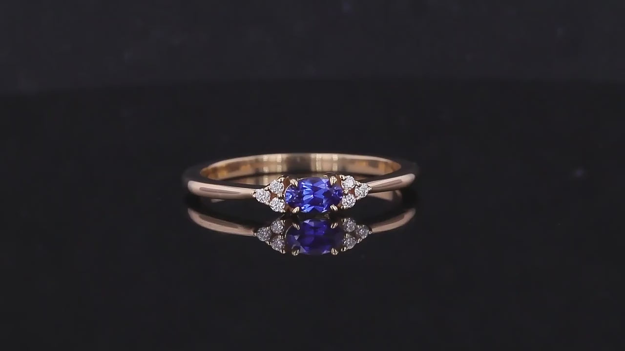 Luther's is pleased to present the 3x5mm Oval Cut Blue Sapphire Ring with Diamond Accents in 14K Solid Yellow Gold, a charming piece designed for those who appreciate delicate elegance. The east to west setting of the lab-grown blue sapphire is enhanced by the sparkle of DEF, VVS diamonds, making this a stunning, yet understated, piece.