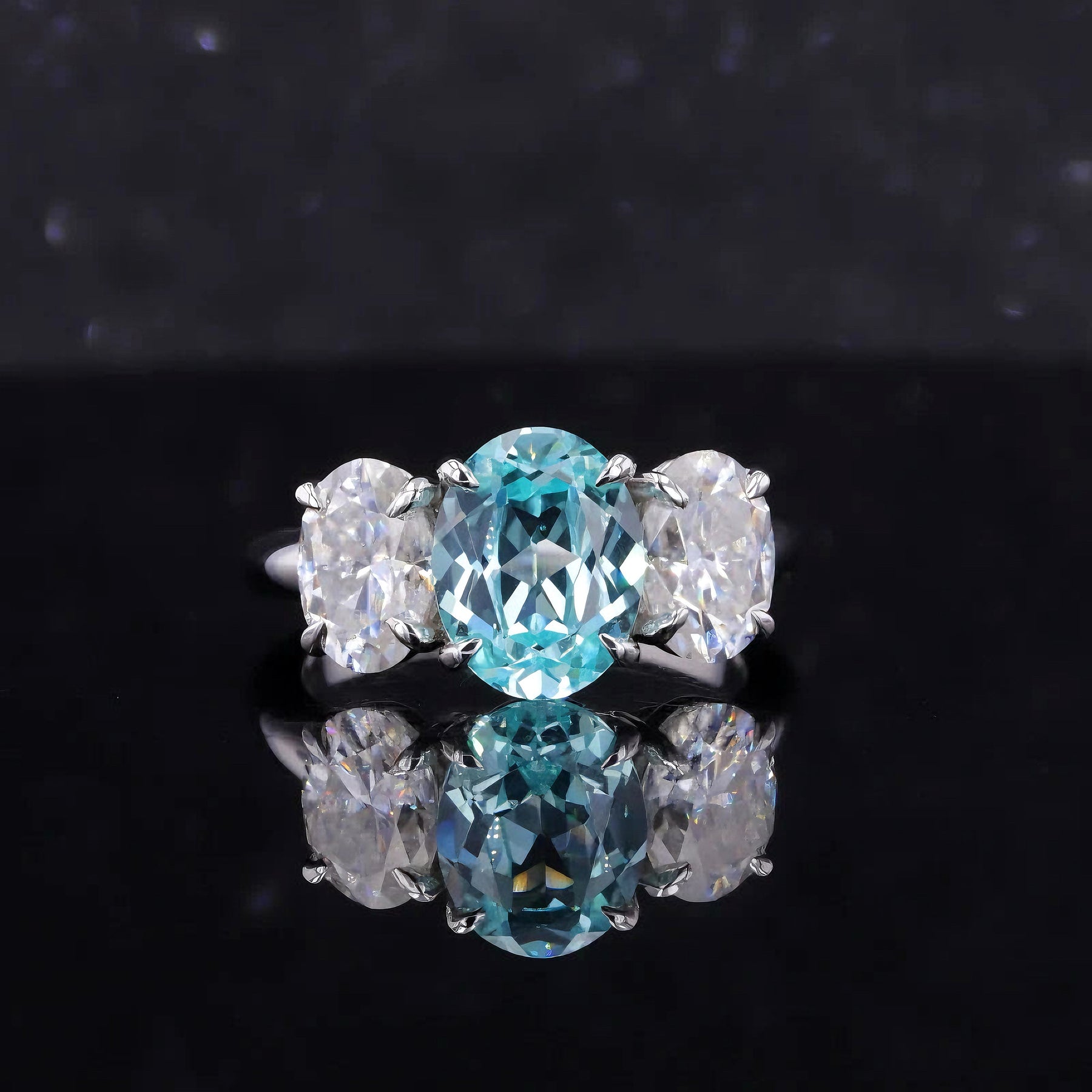 ### Introducing Luther's 7x9mm Oval Cut Paraiba Moissanite Three Stone Ring in 14K Solid White Gold