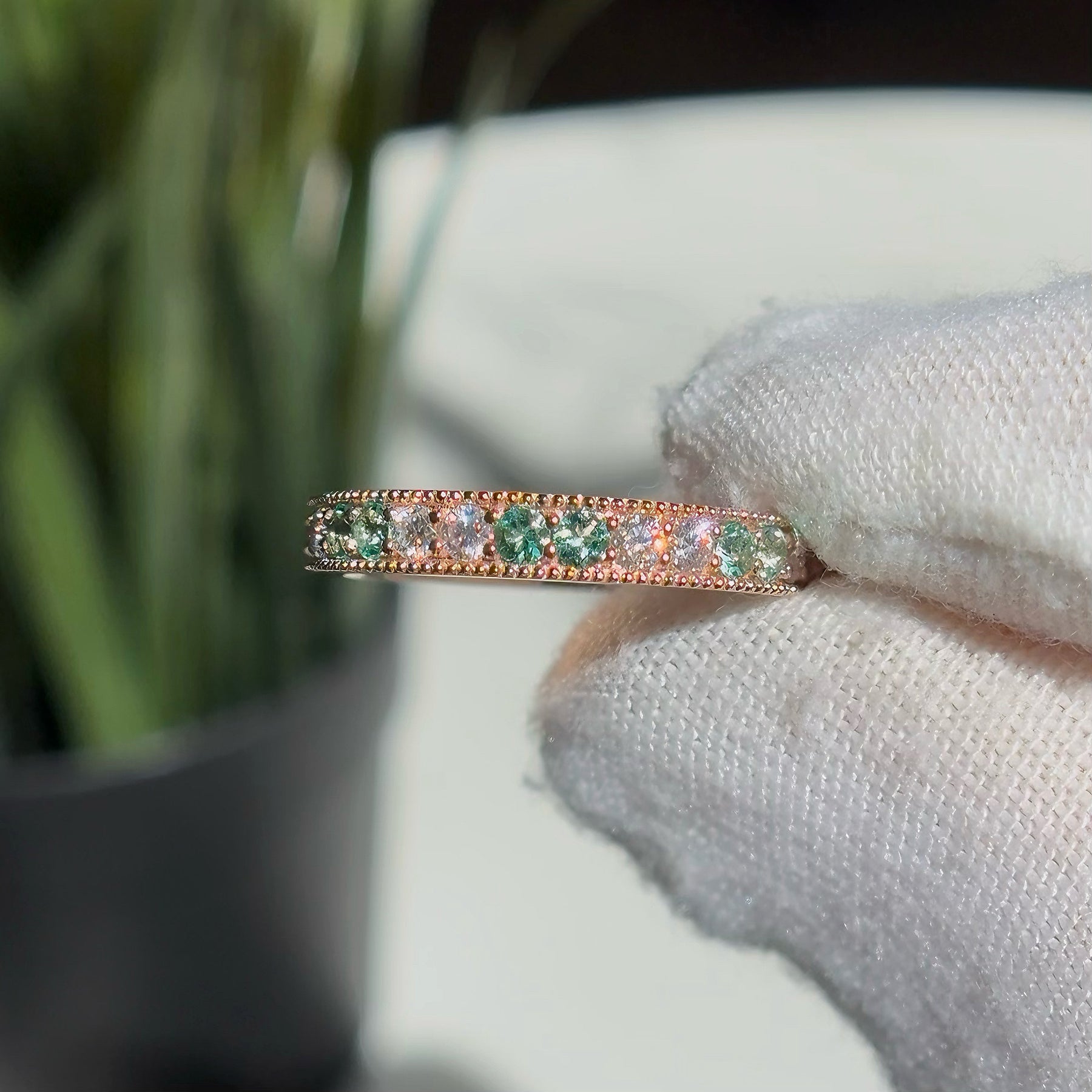 This 1.00ctw eternity ring features alternating Lab-Grown Emeralds and Diamonds set in 14K yellow gold. A timeless symbol of love and renewal, its vibrant green and sparkling white stones make it the perfect choice for weddings, anniversaries, or a refined stacking look.
