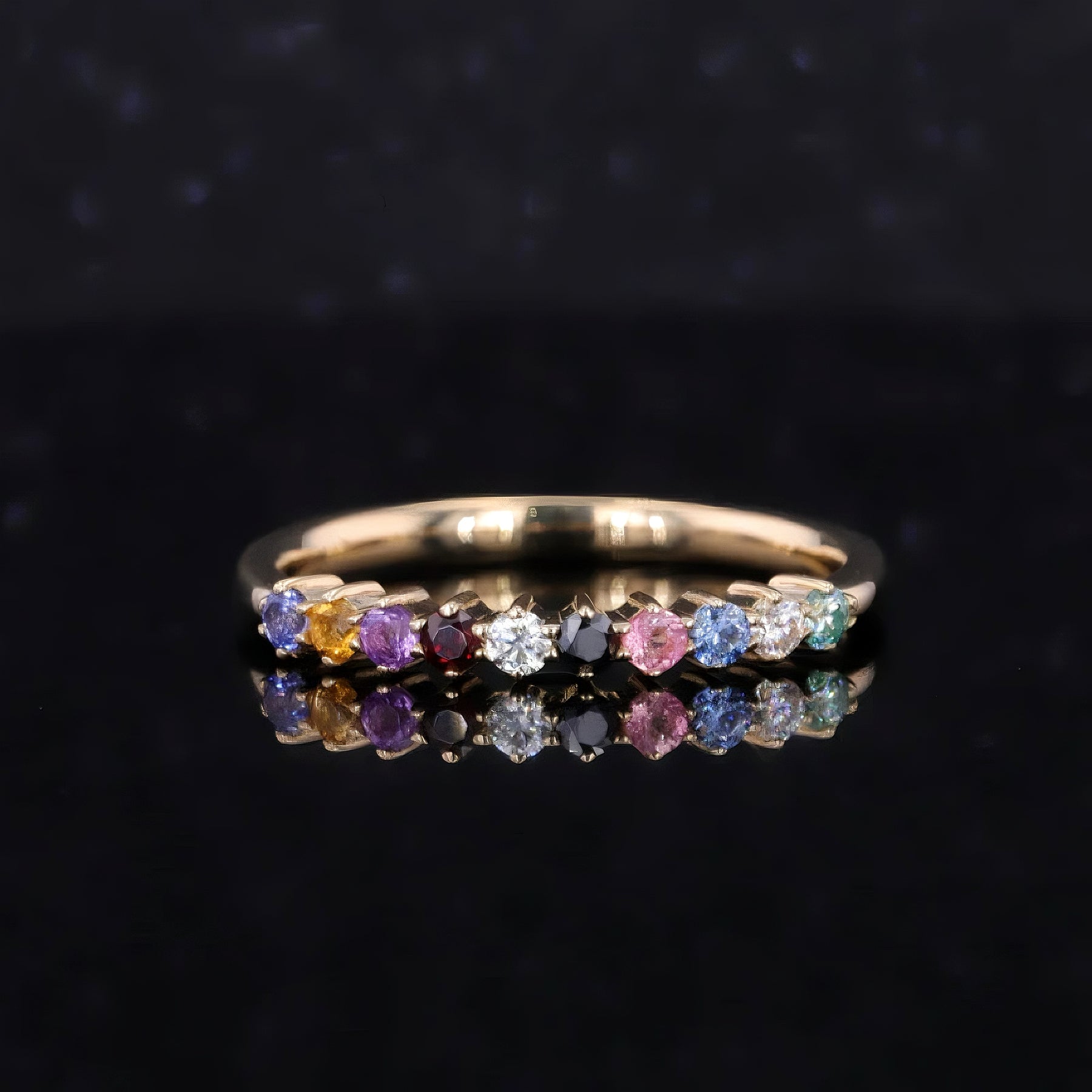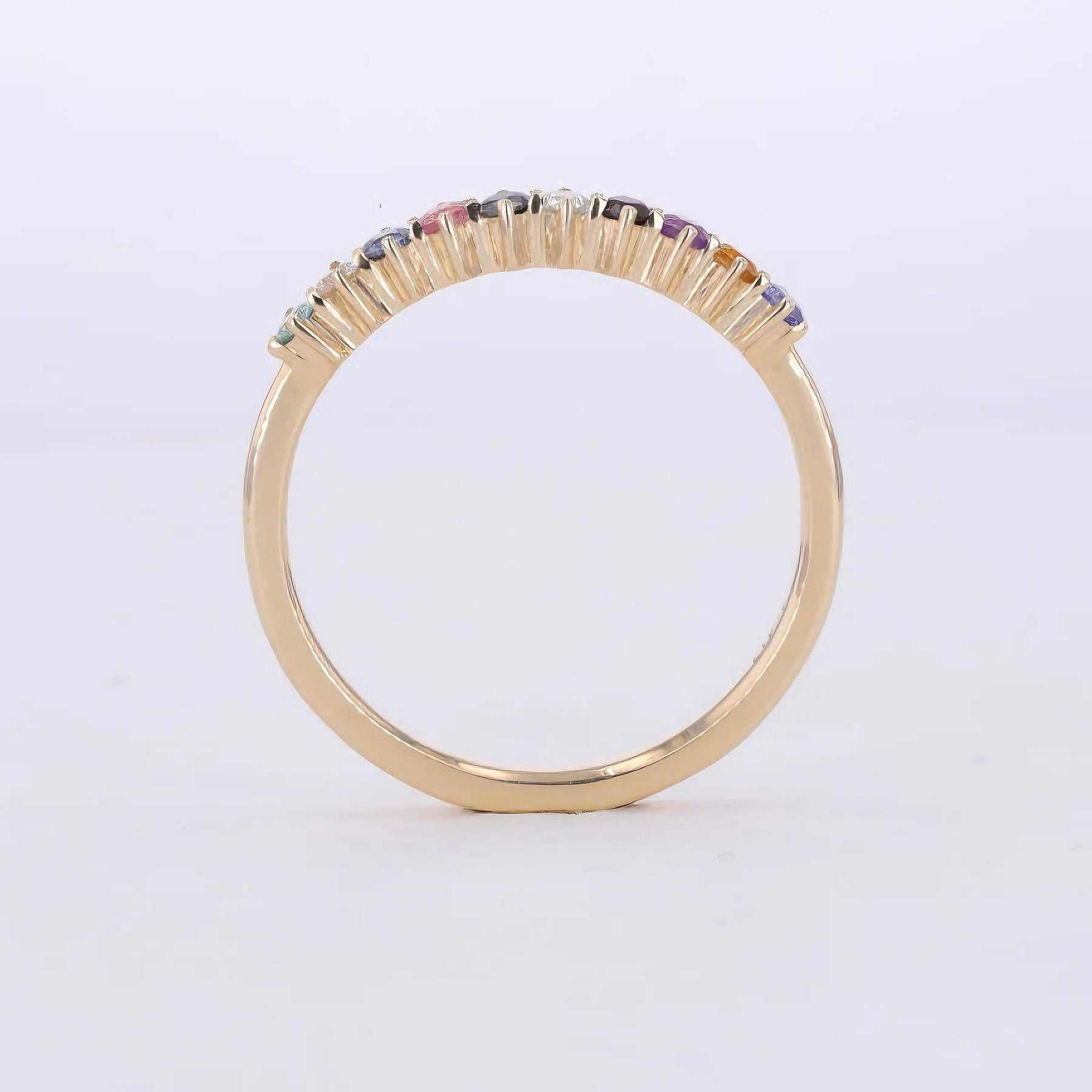 This 2mm Half Eternity Rainbow Ring is a vibrant celebration of color, crafted with round-cut multicolor sapphires in a slim and elegant design. Set in 14K solid yellow gold, this ring combines timeless craftsmanship with a lively modern twist.