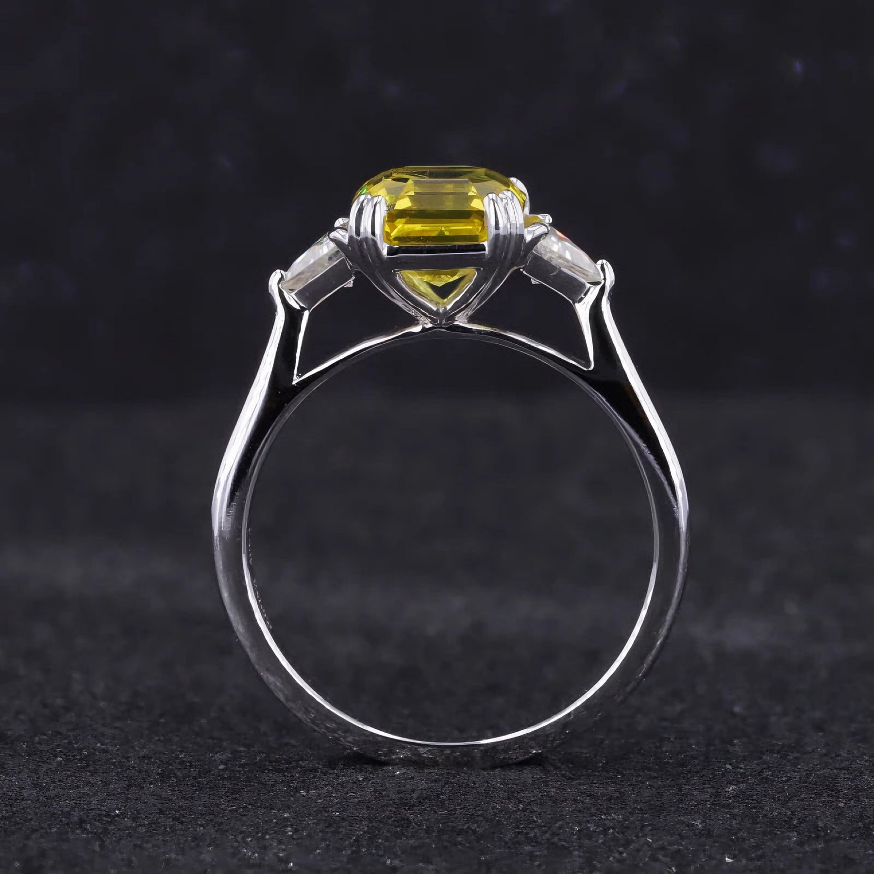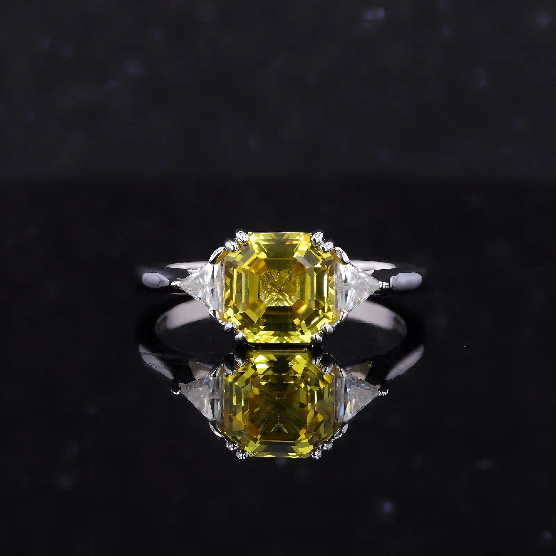 A modern take on a timeless three-stone silhouette. At its center, a 7mm, 2.50ct Asscher-cut yellow sapphire glows with golden brilliance, flanked by two precision-cut side diamonds that frame its radiant geometry.