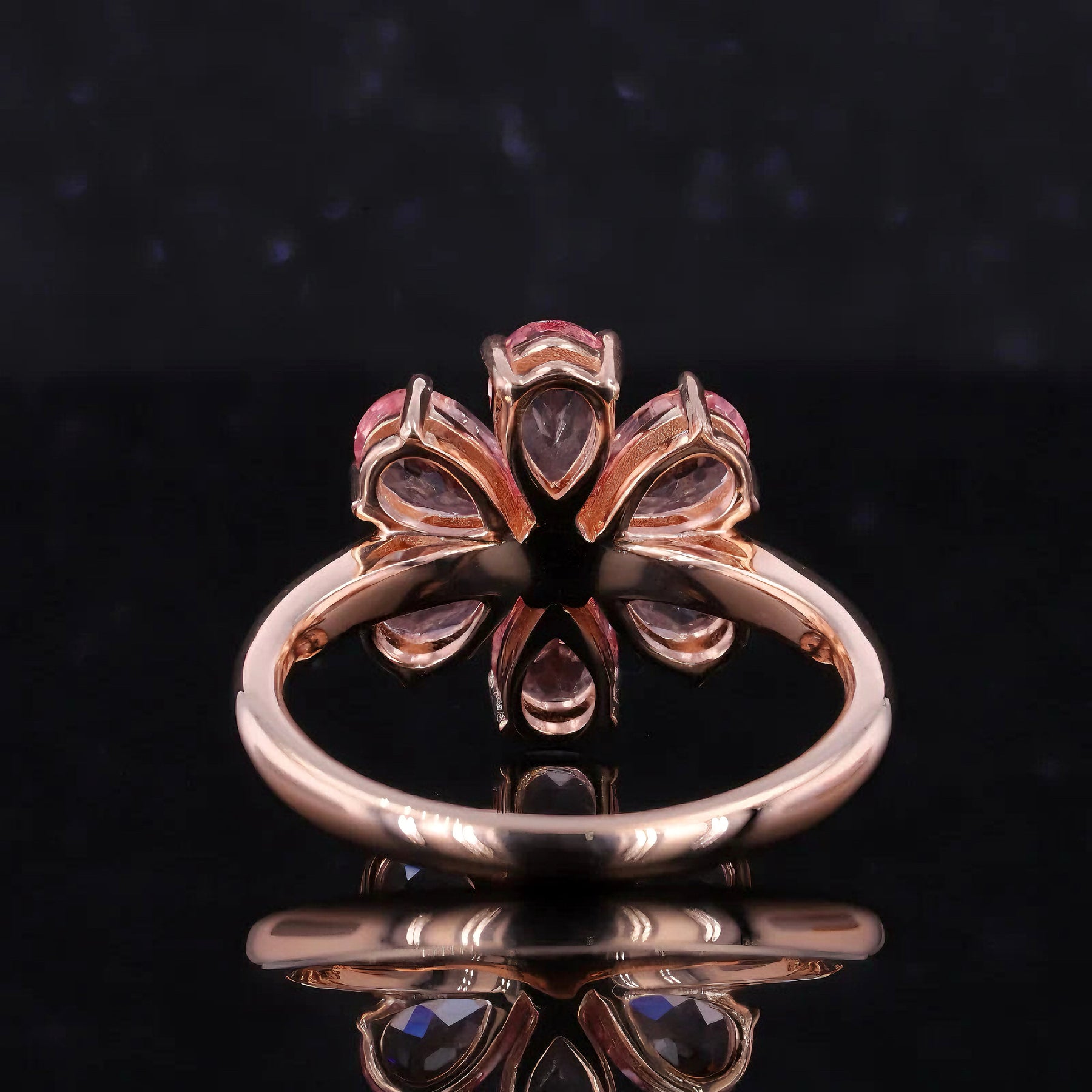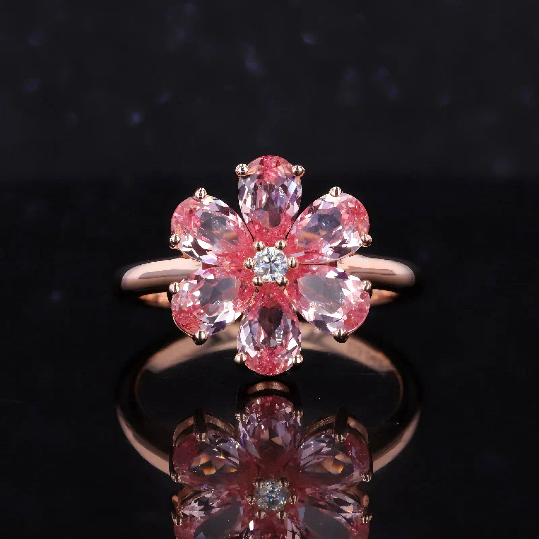Introducing our "Blushing Lily", an enchanting piece crafted in 14K/18K Solid Rose Gold from Luther's Diamonds. This beautiful ring features a sparkling diamond at its center, surrounded by a six-petal, pear cut vibrant pink sapphires.