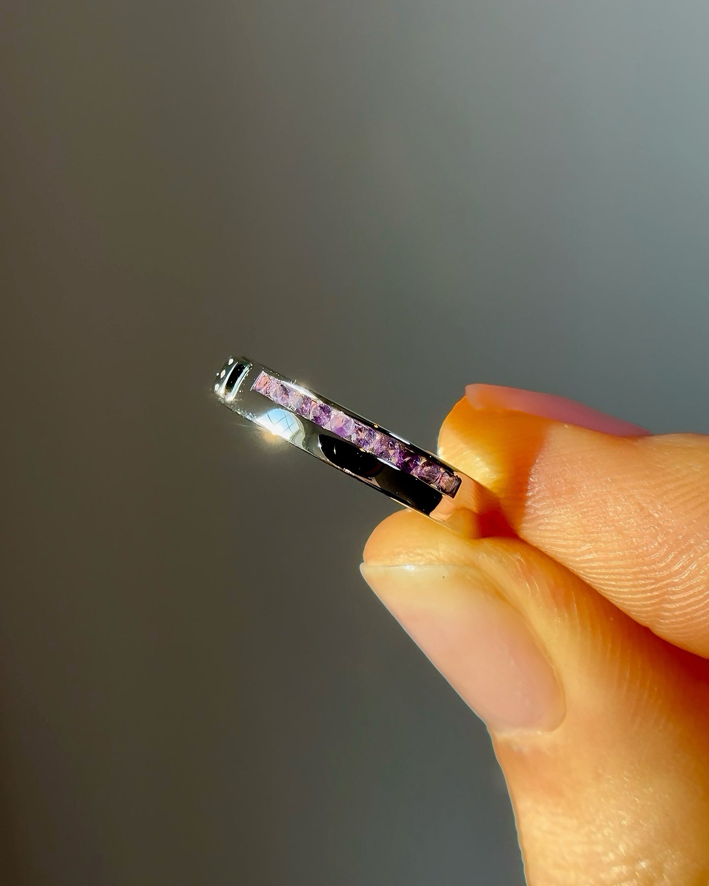 Crafted in solid, durable Sterling Silver, the 5mm Fallen Leaf Band is a quiet tribute to strength forged through solitude. Channel-set twenty natural 1.5mm purple amethysts line the band in a continuous circle — a burning reminder that even those cast from the village carry fire within.