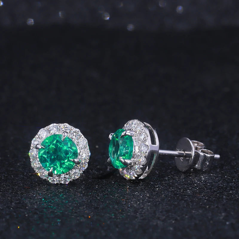 5mm, 0.5ct Each Round Lab-Grown Colombian Emerald with Diamond Halo Earrings in 18K White Gold